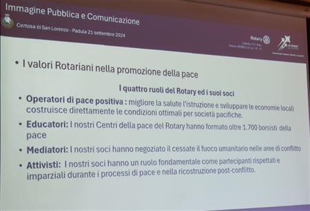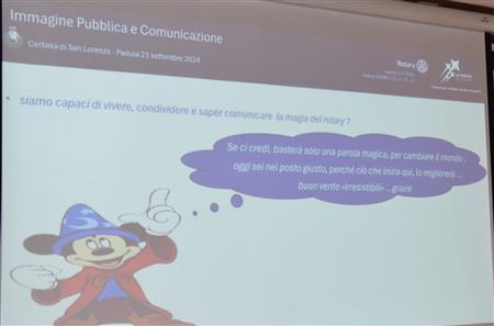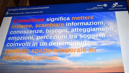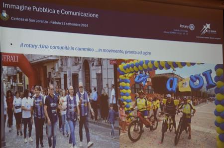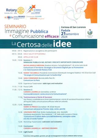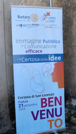 Il ROTARY CLUB NAPOLI NORD con il Presidente Giuseppe Alfano, il Pastpresident, Francesco Schillirò, i Presidenti delle Commissioni: “Progetti di Service”, Alessandro Falco e “Immagine pubblica e Comunicazione”, Paolo Pisanti, hanno partecipato, sabato 21/09/2024, presso la "Certosa di San Lorenzo" a Padula, alla "Certosa delle Idee" Seminario del Rotary International Distretto 2101, Governatore ANTONIO BRANDO, su "Immagine Pubblica e Comunicazione efficace, coordinato da Noemi Taccarelli. Un programma - vedi locandina - ricco di spunti e di interessanti argomenti con illustri e qualificati relatori. In una sala affollatissima, dopo i saluti istituzionali delle numerose autorità presenti, trascinati dal coinvolgente entusiasmo del Governatore, sono intervenuti tra gli altri: Michelangelo Messina, Sara Formisano, Carmen Lasorella e Harry Di Prisco. Qui di seguito, il racconto, attraverso le nostre immagini.