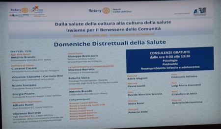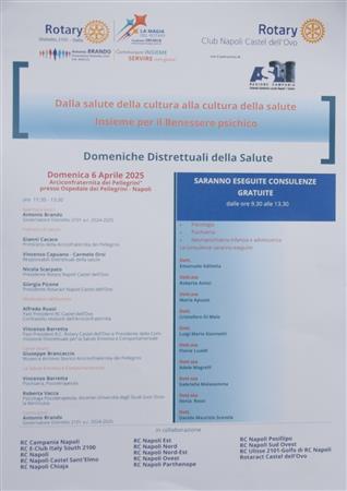 Il ROTARY CLUB NAPOLI NORD, Presidente Giuseppe Alfano, Rotary International Distretto 2101, Governatore Antonio Brando, ha collaborato e partecipato con il Gruppo Partenopeo, alla 5^ Domenica Distrettuale: "Dalla salute della cultura alla cultura della salute con Focus: Benessere psichico" presso l'Arciconfraternita dei Pellegrini, organizzata dal Rotary Club Napoli Castel Dell'ovo, Presidente Nicola Scarpato. La giornata è stata introdotta dal Governatore Antonio Brando e moderata da Vincenzo Barretta e Alfredo Ruosi. Una mattinata di grande interesse, con interventi come da programma, dove è stata affrontata la problematica relativa al recupero del benessere psichico con prevenzione, impegno, ascolto. Di grande interesse la storia e il ruolo dell'Arciconfraternita dei Pellegrini ha ospitato l'evento. Il mio nostro racconto fotografico.