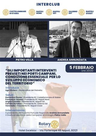 Lunedì 5/2/24, all'Excelsior, Conviviale, in IC, dei RC Castellammare Pres. D. Picone, RCNA Nord Pres. F. Tavassi, RCNA Est Pres. A. Coviello, RCSA Est Pres. C. De Felice e RCNA Ovest Pres. V. Gallo. Sono intervenuti A. Annunziata, presidente dell'Autorità Portuale Regionale e l'Ammiraglio P. Vella, Direttore Marittimo Campania che hanno illustrato ai numerosi Soci, Ospiti e Autorità rotariane presenti: "Gli importanti interventi previsti nei porti campani, condizione essenziale per lo sviluppo economico del territorio". Ha introdotto i lavori il DG del R.I. D2101 U. Oliviero. Dopo i saluti dei Presidenti dei Club, il Presidente Annunziata ha ricordato tutti gli interventi, nei porti Campani, che con oltre 600 milioni del PNRR hanno raggiunto record storici, e l’auspicio per una forte diminuzione della burocrazia. L'Ammiraglio Vella ha ricordato il lavoro assiduo di controllo della sua struttura per garantire la crescita con le necessarie sicurezze. Numerosi gli interventi dei presenti