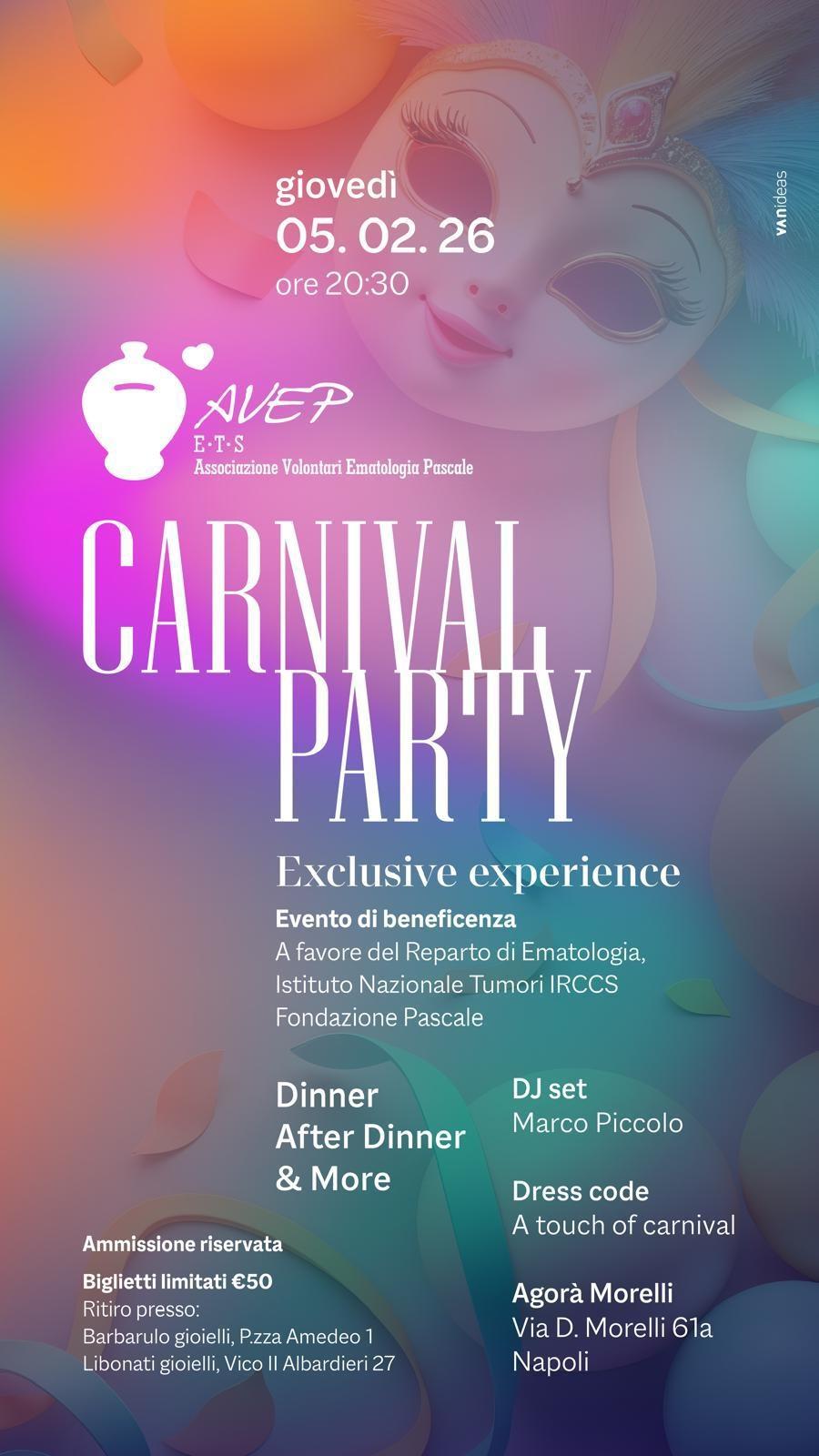 Gran party di beneficenza "CARNIVAL PARTY - Exclusive esperience", giovedì 6/02/26, all' Agorà Morelli, a favore dell''AVEP Ets, a sostegno dell'Ematologia della "Fondazione G. Pascale". Una serata speciale in allegria con la musica del DJ Set Marco Piccolo. Il ROTARY CLUB NAPOLI NORD – RI D2101, Gov. Angelo Di Rienzo, da sempre sostenitore e benefattore, era presente con il Presidente Renato Franceschelli, con Cecilia, il PP Giuseppe Alfano, il PI Alessandro Falco con Alessandra, i consiglieri Valerio Maione con Amelia, Carlo Ruosi con Enrica, i soci Francesco Orefice con Simona Catuogno, artefici dell'iniziativa Ugo Cilento, Pietro Paolo Ferraro, Paolo Pisanti, Bruno Riccardi e Liliana Speranza. È stata l'occasione per presentare a tutti i presenti un rendiconto dell'attività, con gli ottimi risultati raggiunti, con € 1.435.726,00 raccolti, un utilizzo di € 1.303.197,00 con tra l'altro, 3.665 interventi, l'acquisto di beni strumentali e attività varia nei reparti.