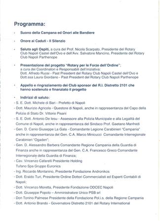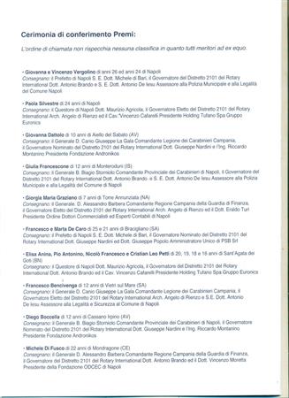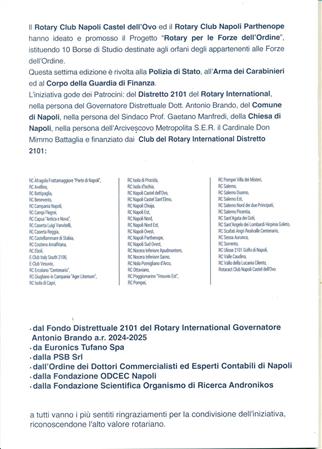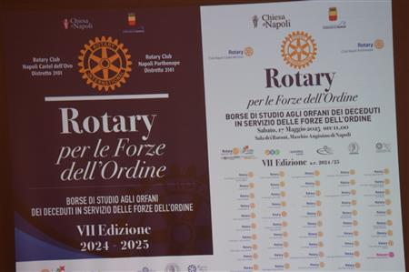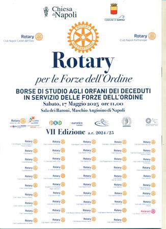 ll Rotary Club Napoli Nord , Presidente Giuseppe Alfano, Rotary International Distretto 2101, DG Antonio Brando, ha aderito e partecipato, sabato 17/05/25 nella Sala dei Baroni del Maschio Angioino di Napoli, alla VII edizione del Premio "Rotary per le Forze dell' Ordine" ideato e promosso dai RCNA Castel dell'Ovo e Parthenope con il Patrocinio del Comune di Napoli e della Chiesa di Napoli, con il sostegno del Distretto 2101, del nostro Club e di altri 48 Club e di numerosi Sponsor. Questa edizione ha visto la consegna di 10 borse di studio agli Orfani dei deceduti in servizio alla presenza di autorità civili e militari, il tutto come da programma. Presenti i Consoci Angelo Di Lauro, Francesco Schillirò e Paolo Pisanti nella sua qualità di Presidente della Commissione Immagine Pubblica e Comunicazione efficace del Club e membro dell'omologa Commissione distrettuale.